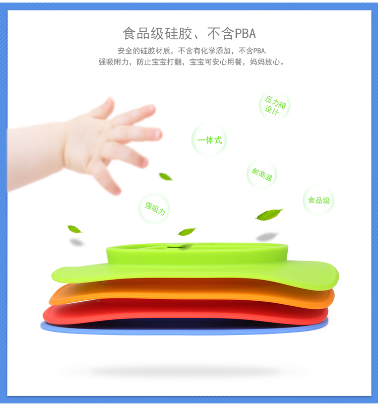 2.硅胶餐盘有独特的压力阀设计,吸附能力更强,宝宝难打翻,妈妈易拿起。